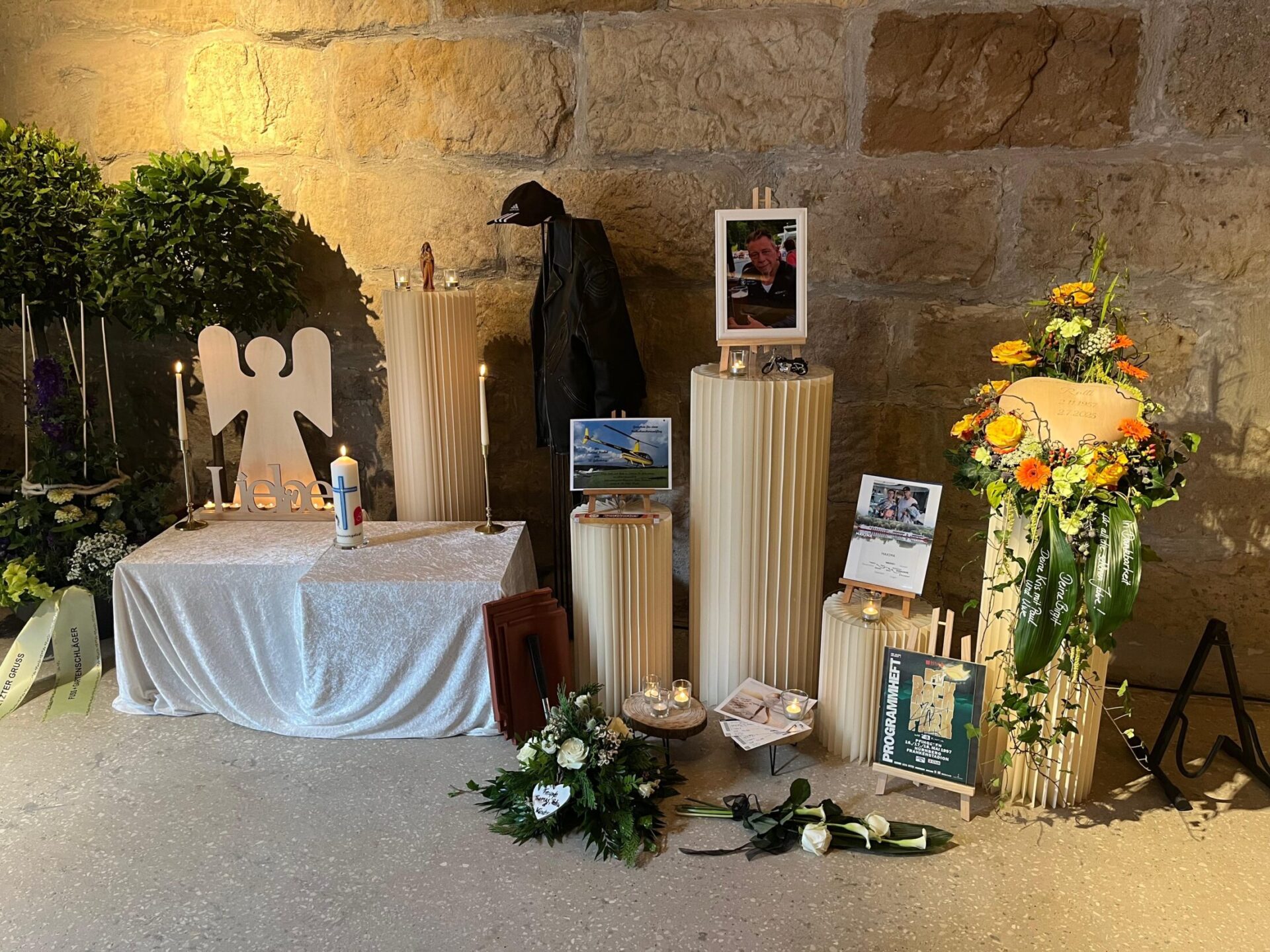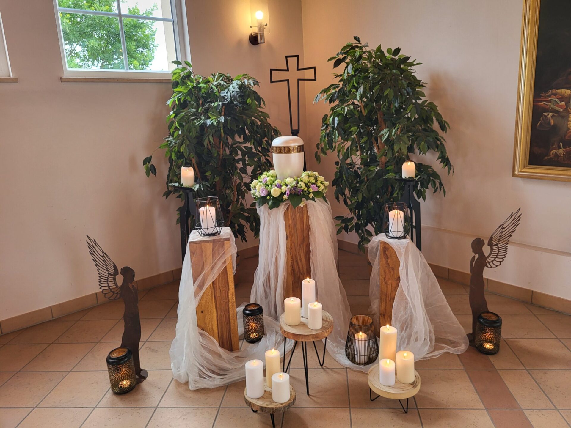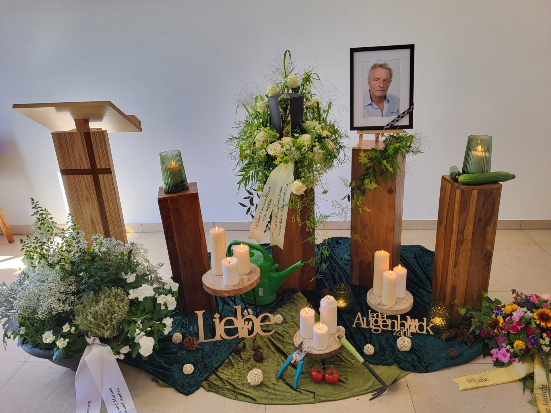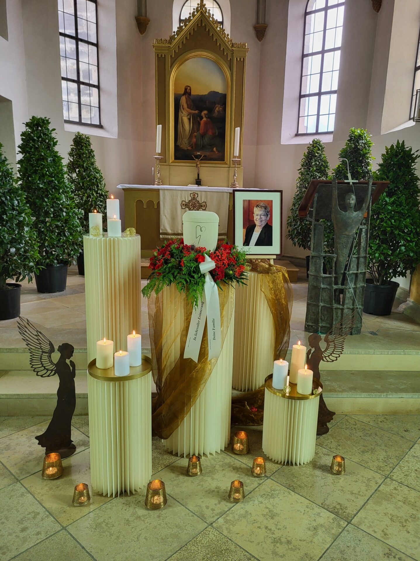 Eine Trauerfeier kann an verschiedenen Stellen stattfinden: In einer Kirche, auf einem Friedhof begleitend zu einer Bestattung dort im Freien oder in einer Friedhofskapelle, in einer gemeindlichen oder privaten Trauerhalle, als auch von der Beisetzung getrennt im Garten eines Privathauses oder entsprechend großzügigen Räumlichkeiten. Wir ermöglichen eine individuelle Gestaltung der Trauerfeier.